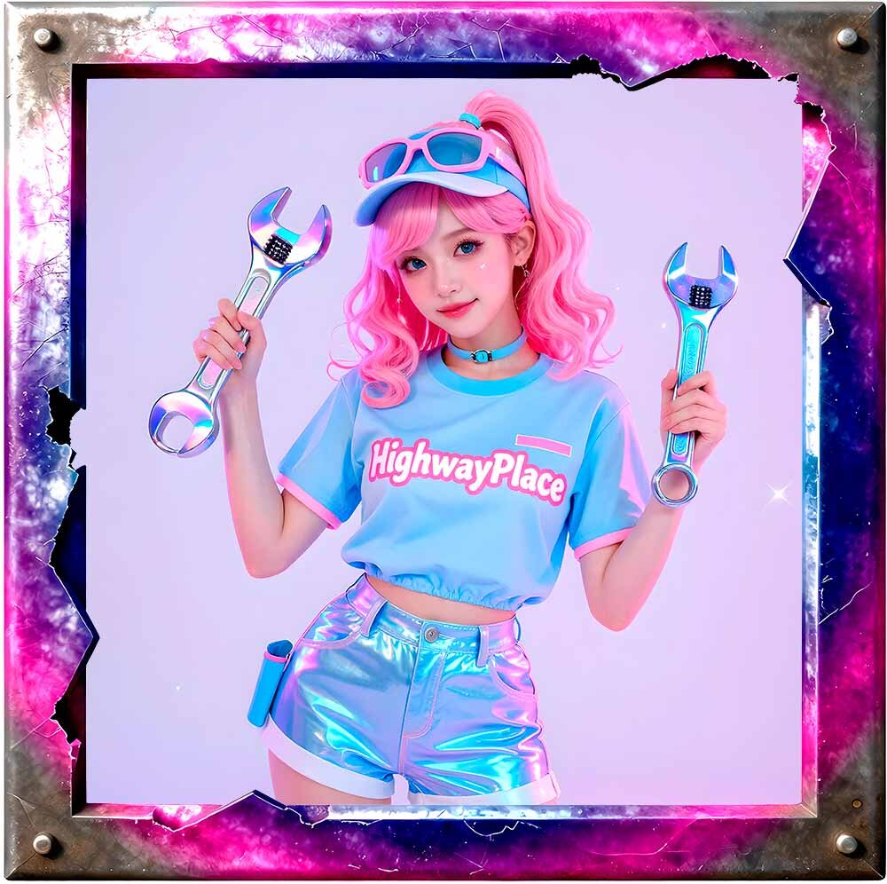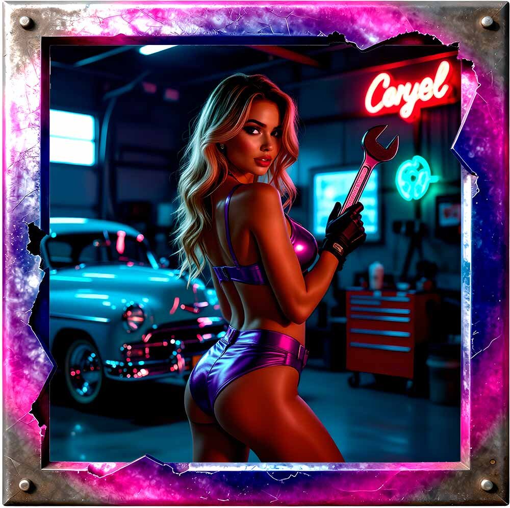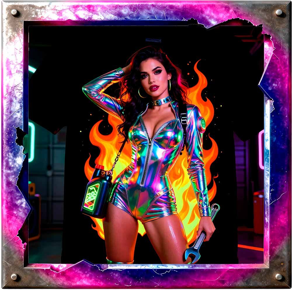 Candy Chrome Mechanics ist eine neonleuchtende Pin‑Up‑Kollektion, in der klassische Mechanic‑Girl‑Ästhetik auf futurischen Candy‑Gloss trifft. Chrom, Neon, Holografie und HighwayPlace‑Branding verschmelzen zu einer kraftvollen Mischung aus Retro‑Garage‑Vibes und modernem AI‑Art‑Design.