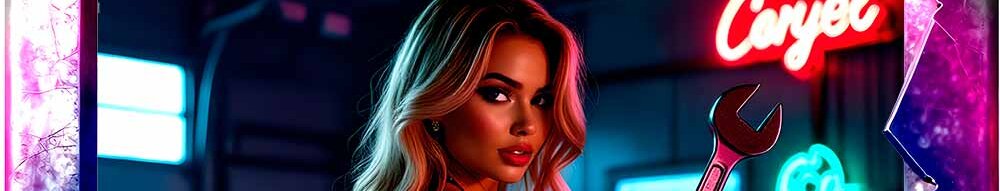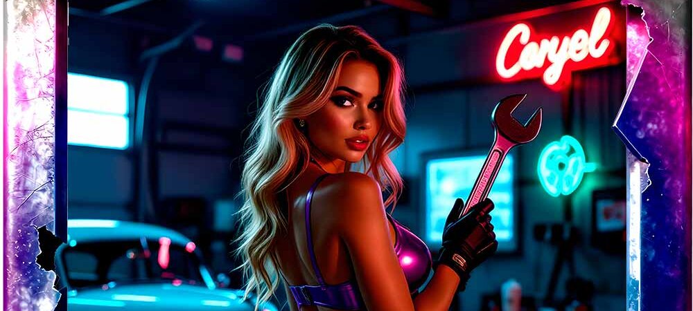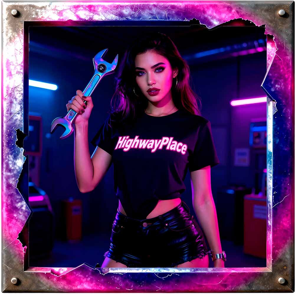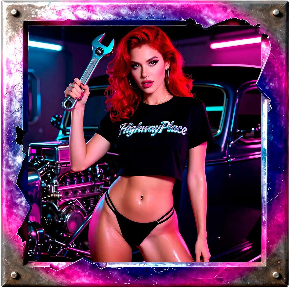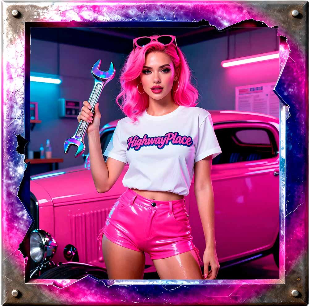 Candy Chrome Mechanics ist eine neonleuchtende Pin‑Up‑Kollektion, in der klassische Mechanic‑Girl‑Ästhetik auf futurischen Candy‑Gloss trifft. Chrom, Neon, Holografie und HighwayPlace‑Branding verschmelzen zu einer kraftvollen Mischung aus Retro‑Garage‑Vibes und modernem AI‑Art‑Design.