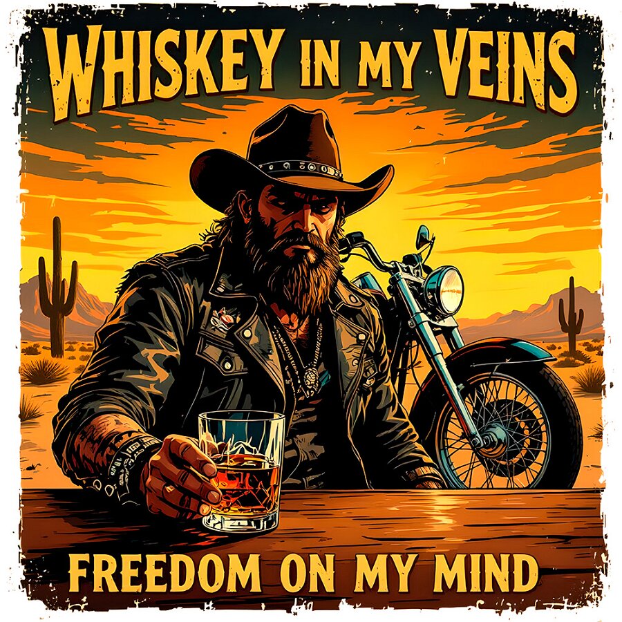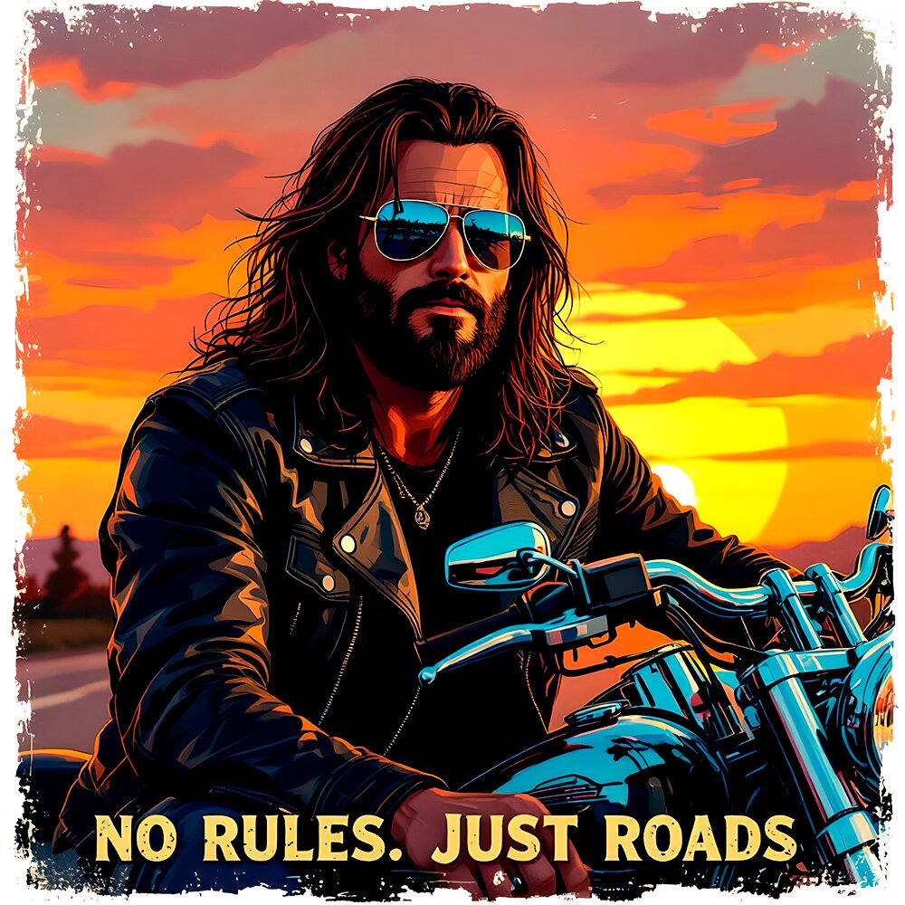 Benzin, Leder, Freiheit: kraftvolle Biker-Illustrationen im Vintage-Realismus. Lange Haare, Bärte, Chrom & Staub – echte Charaktere mit Haltung. Inspirierte Americana-Poster, starke Kontraste, handgemalte Texturen. Für alle, die laut fahren und frei leben. Ride Loud. Live Wild. Stay Free.