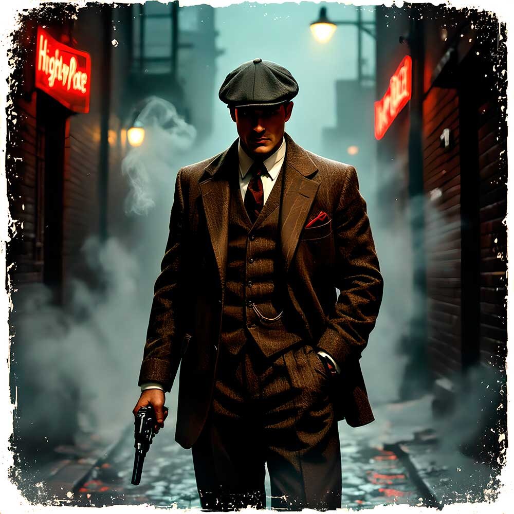 Dunkle Eleganz der 20er & 30er: scharfe Anzüge, Schiebermützen und rauer Noir-Charme. Vintage-Stil trifft Dramatik und zeitlosen Rebellionsgeist – perfekt für alle, die ein Statement setzen wollen.