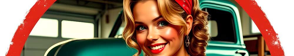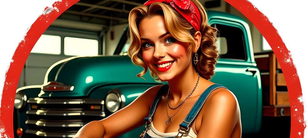 Dieses einzigartige Retro-Design zeigt eine Pin-up Mechanikerin in Werkstattmontur, die an einem klassischen Oldtimer schraubt. Perfekt für Liebhaber von Vintage, Rock’n’Roll und Oldtimer-Kultur. Ideal für Shirts, Poster oder Accessoires. Bringt 50er-Jahre Werkstatt-Feeling in dein Outfit oder Deko.